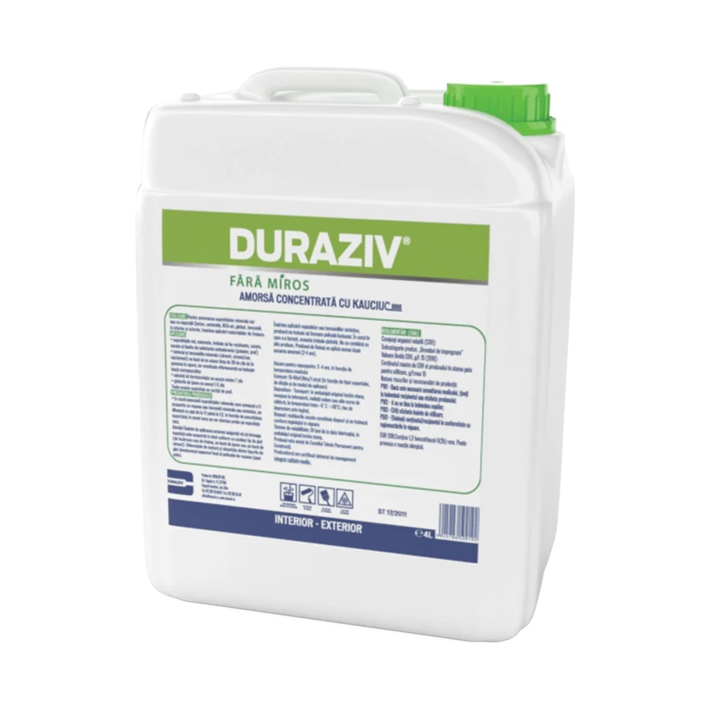 Domeniu de aplicare: DURAZIV FĂRĂ MIROS Amorsă concentrată cu Kauciuc® este o amorsă de impregnare, pe bază de dispersii organice speciale, pentru suprafeţe minerale, pentru amorsarea şi pregătirea suprafeţelor minerale noi sau cu reparaţii la interior și exterior, înaintea aplicării materialelor de finisare (vopsele sau tencuieli sintetice). Amorsa concentrată este un lichid alb lăptos, cu pH 7,5 – 8,5 (alcalin), conținutul maxim de COV în stare gata pentru utilizare este max. 1 g/l față de 30 g/l – valoarea limită COV, UE: categ. A/h 30 – grunduri de impregnare (2010). În formularea produsului au fost înlocuite sau au fost reduse la minim substanțele care pot agresa organismul uman și mediul, prin compoziție sau miros (solvenții folosiți ca agenți de coalescență, biocizii, formaldehida liberă, amoniacul și aminele, monomerii acrilici nereacționați, plastifianții, substanțele cancerigene și mutagene). Se aplică nediluată sau în diluţie cu apă de la 1:1 până la 1:3, în funcţie de porozitatea suportului (în acest sens se vor efectua probe pe suprafeţe mici). Se aplică pe suporturi din beton, cărămidă, tencuială, sisteme termoizolante, glet, BCA, gips-carton etc.