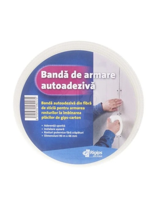 Banda de armare Rigips autoadeziva din fibra de sticla este utilizata pentru intarirea rosturilor dintre placile de gips-carton, prevenind fisurarea si asigurand o finisare de calitate. Produsul este fabricat din fibra de sticla rezistenta la intindere, avand o durata de viata indelungata si o capacitate excelenta de consolidare a imbinarilor.